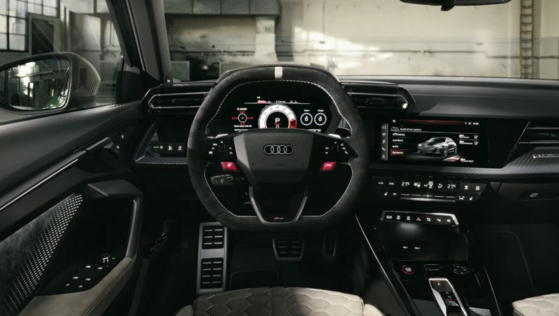 De techgeek komt in de Audi RS3 Competition Limited ook niets tekort. Het infotainmentscherm toont diverse prestatiegegevens, zoals temperaturen van de motor, remmen en transmissie, evenals bandenspanning en bandentemperatuur. Deze worden afgebeeld met een speciale witte screensaver. Dat is dan weer een knipoog naar de klassieke RS-modellen uit het verleden.