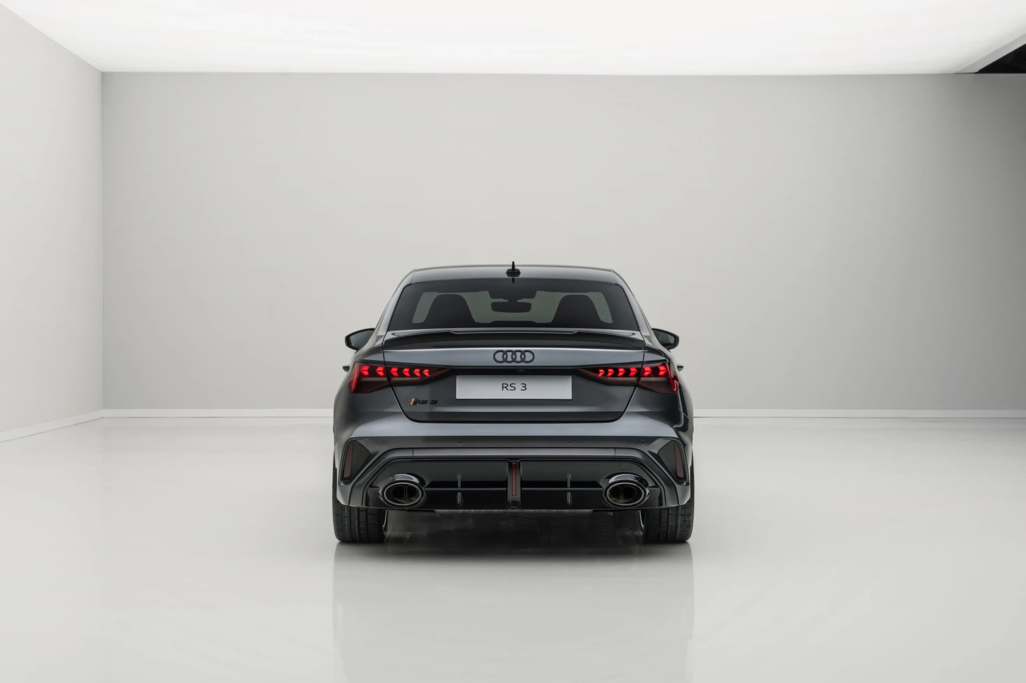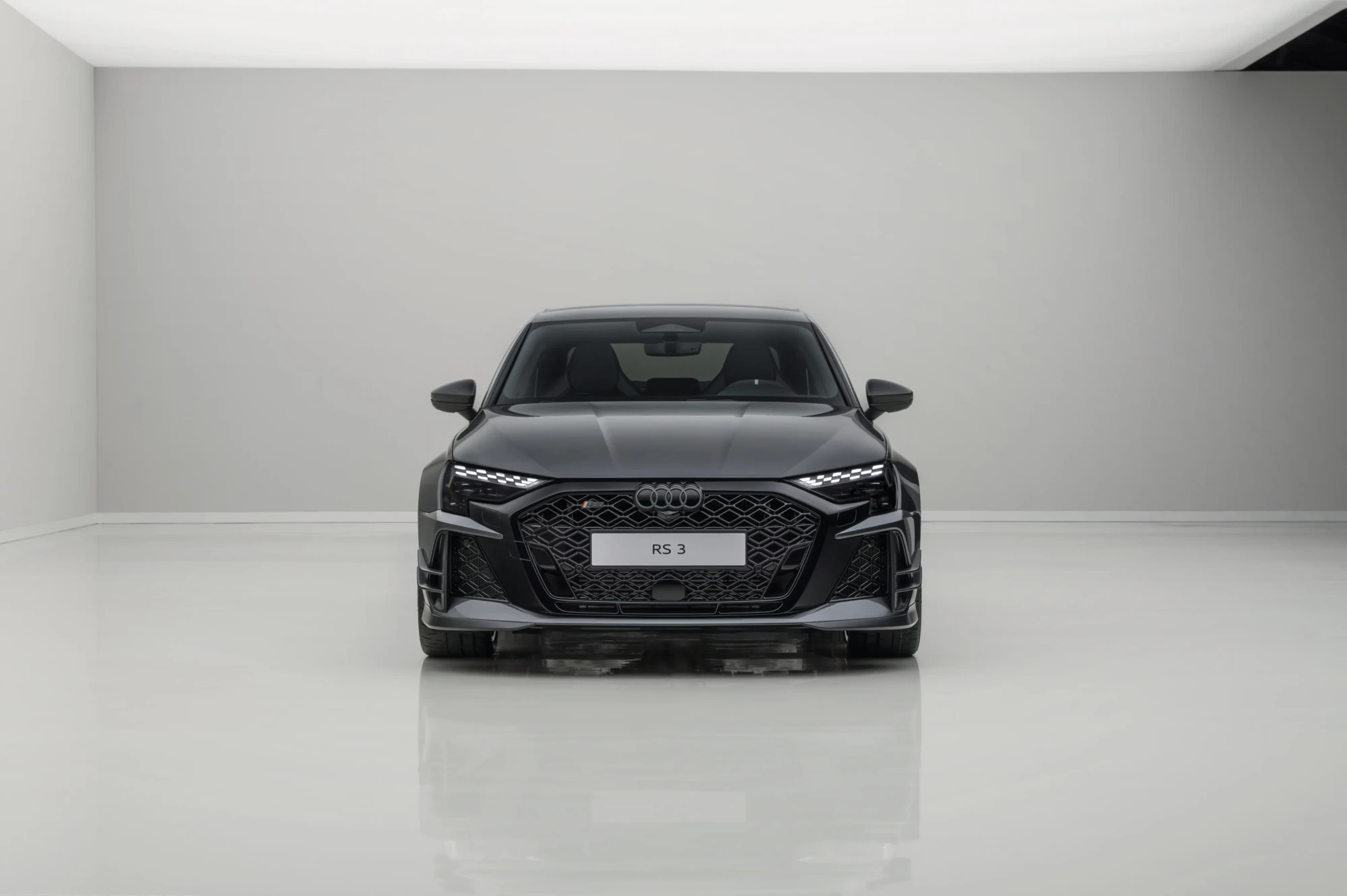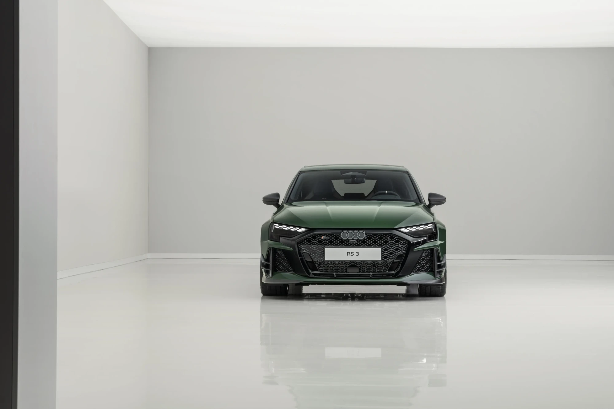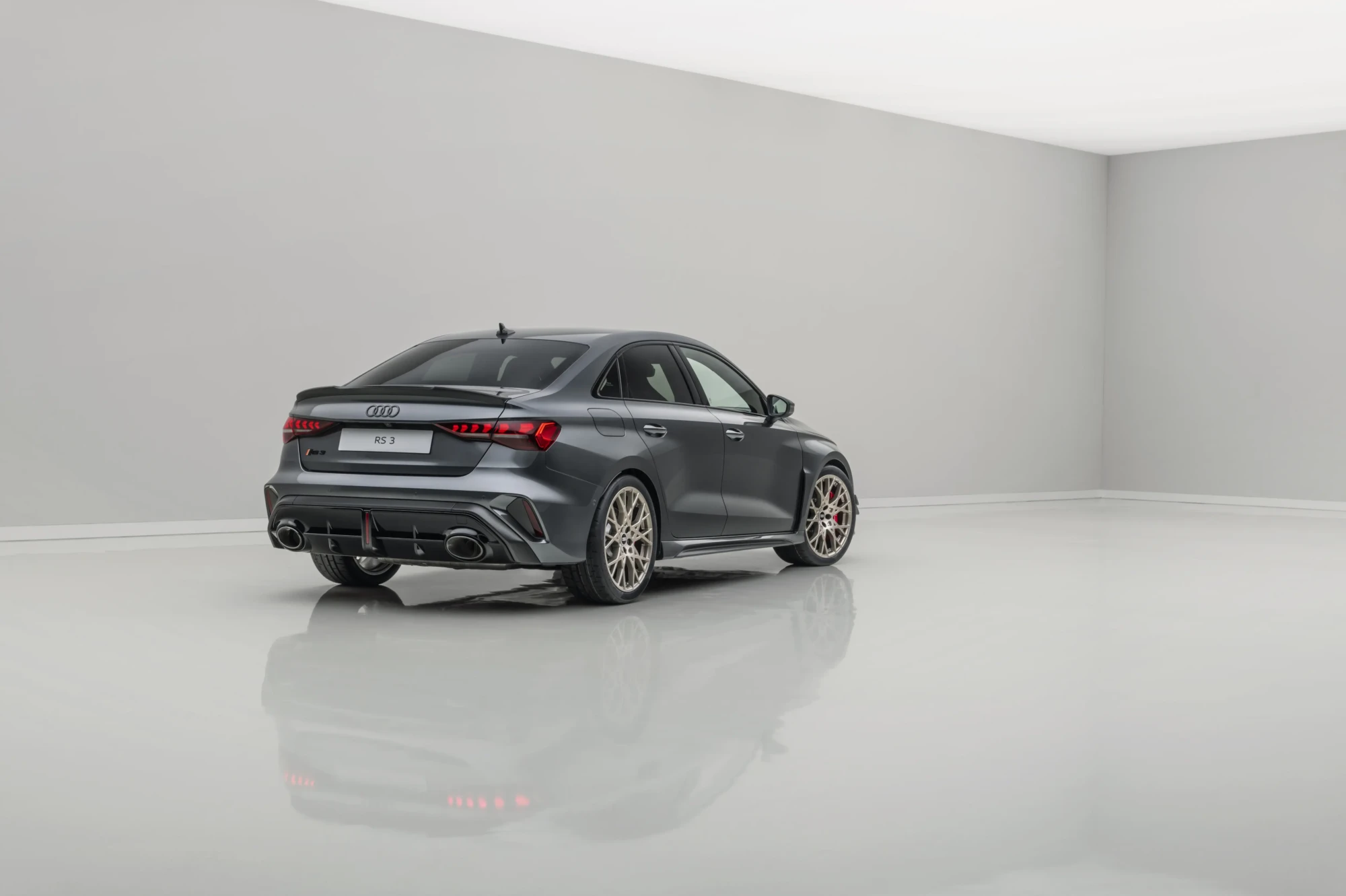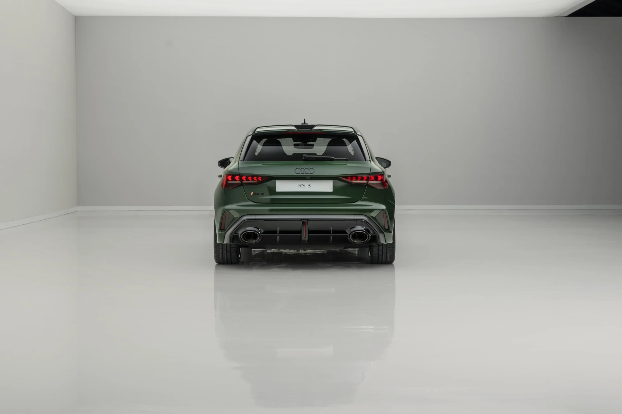 Om het feestnummer van de Duitsers niet té heftig te maken, is er aan de buitenzijde gekozen voor een subtiele, doch agressievere afwerking. Zo is de voorbumper voorzien van vleugels op weerszijden met toevoeging van een subtiele spoilerlip. De sedan en Sportback worden geleverd in drie kleuren: Daytona Grey, Glacier White Matte en Malachite Green. Eén van deze drie kleuren, in combinatie met de 19-inch velgen afgewerkt in het goud, maakt deze hot hatchback dan ook een eyecatcher waarmee je zowel op kantoor als de kinderopvang voor de dag kan komen. Verder heeft de cosmetische afdeling de auto voorzien van diverse matte carbonaccenten, zoals de spiegelkappen, side skirts en achterspoiler. Ook de verduisterde matrixkoplampen en de grote diffuser aan de achterzijde dragen bij aan het feestelijke karakter. Om aan te tonen dat het geen normale RS3 is, wordt de auto afgewerkt met speciale logo’s en typeplaatjes.