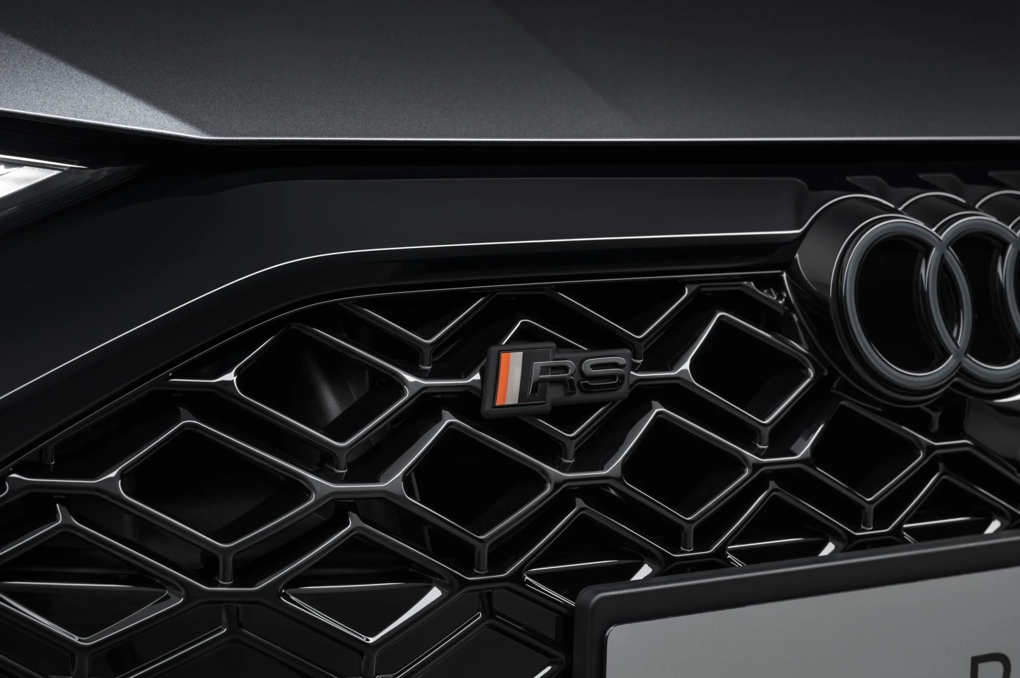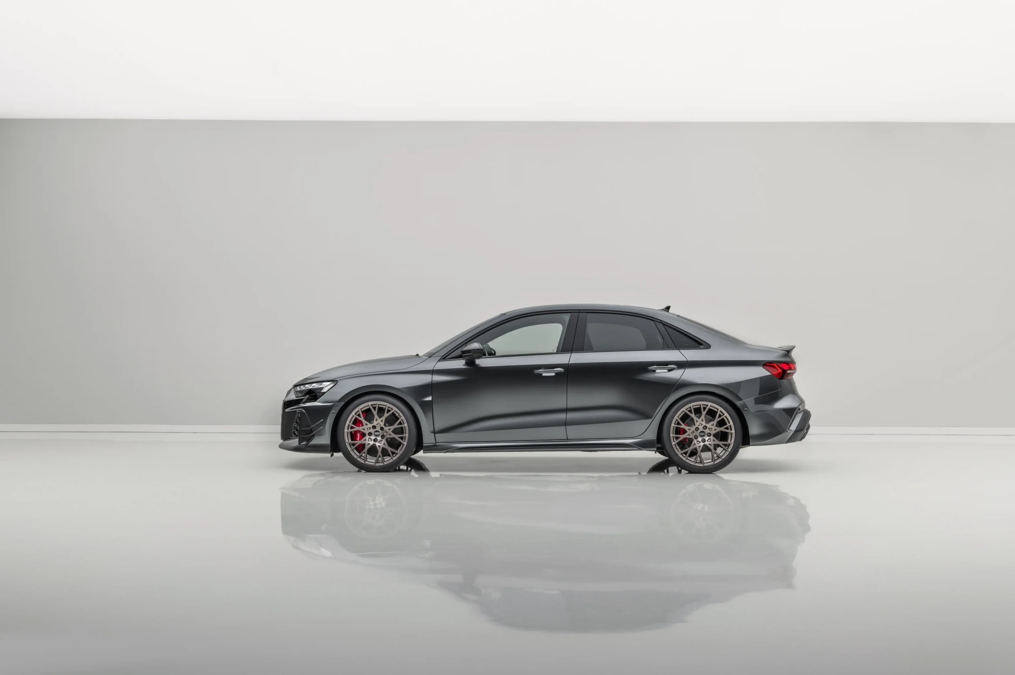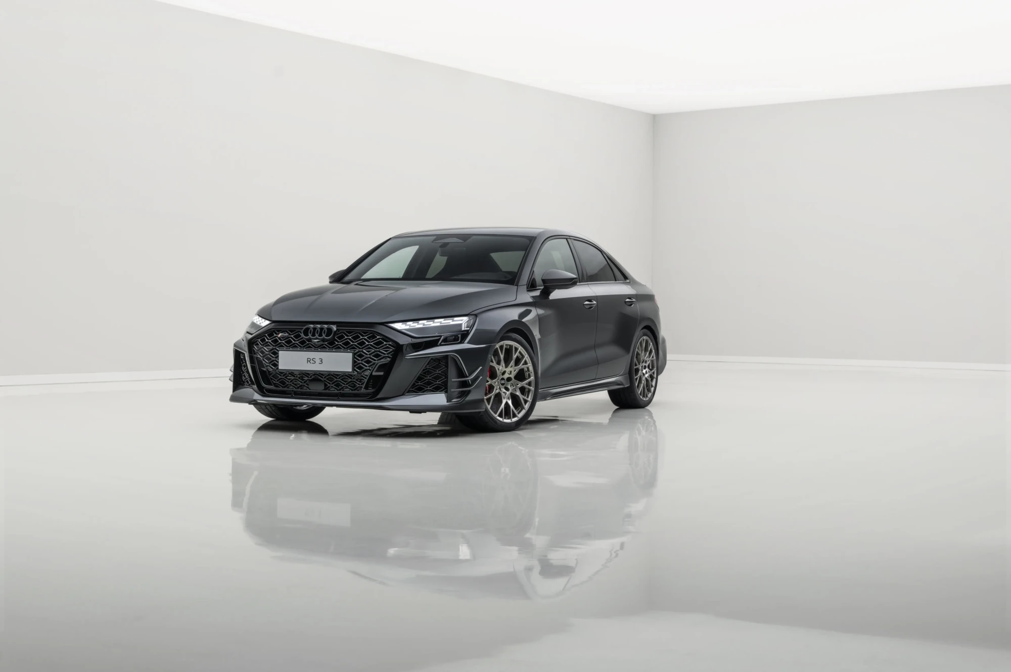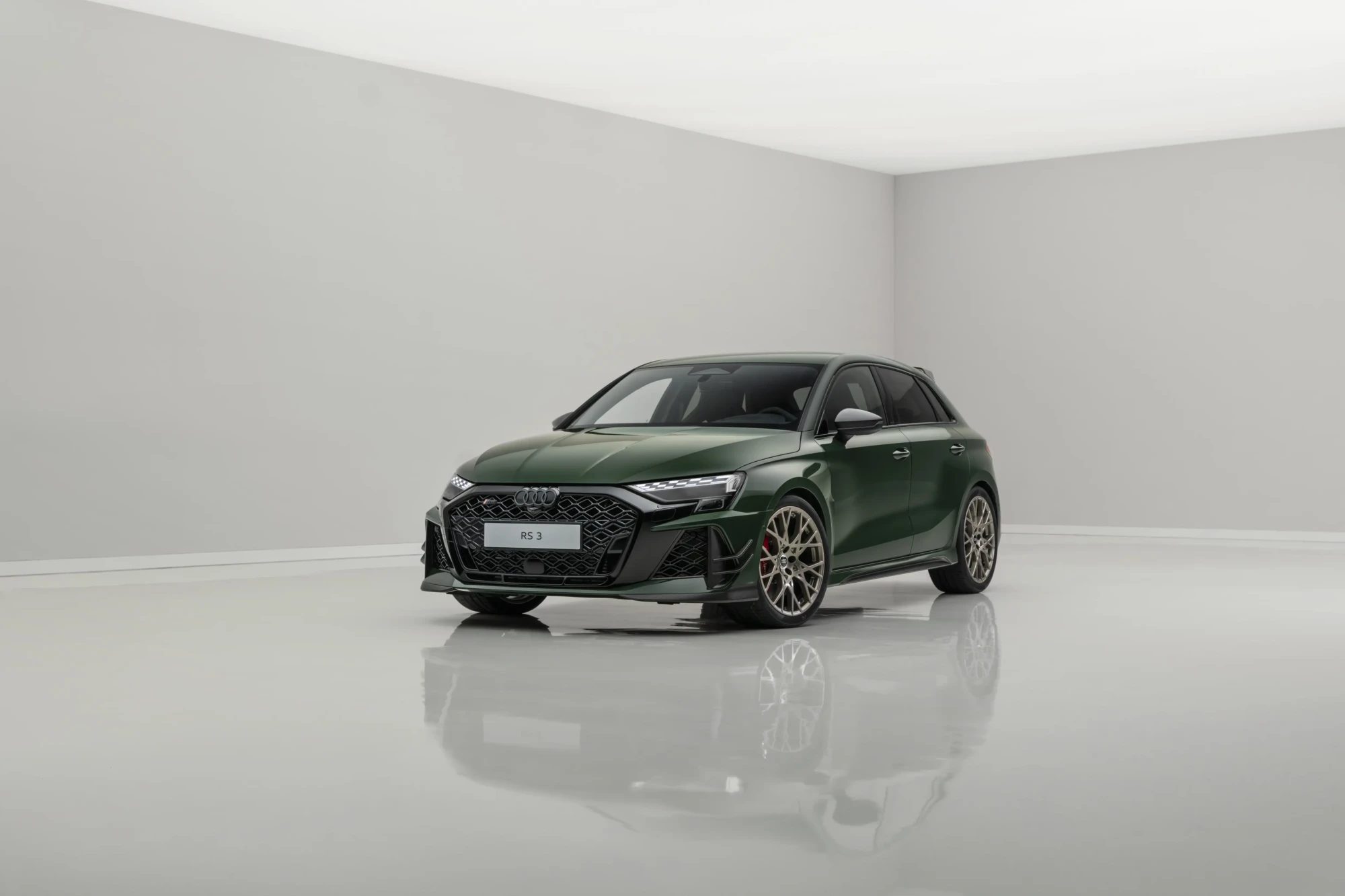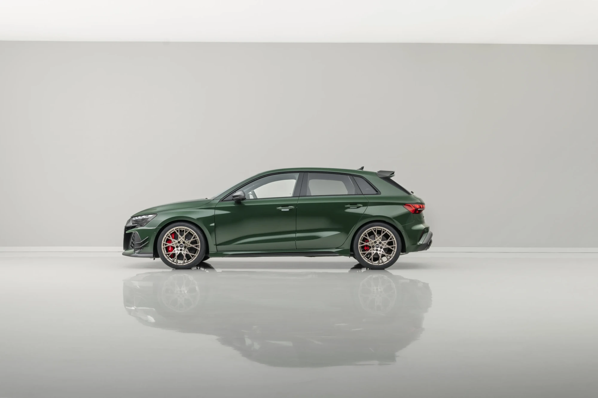 Om het feestnummer van de Duitsers niet té heftig te maken, is er aan de buitenzijde gekozen voor een subtiele, doch agressievere afwerking. Zo is de voorbumper voorzien van vleugels op weerszijden met toevoeging van een subtiele spoilerlip. De sedan en Sportback worden geleverd in drie kleuren: Daytona Grey, Glacier White Matte en Malachite Green. Eén van deze drie kleuren, in combinatie met de 19-inch velgen afgewerkt in het goud, maakt deze hot hatchback dan ook een eyecatcher waarmee je zowel op kantoor als de kinderopvang voor de dag kan komen. Verder heeft de cosmetische afdeling de auto voorzien van diverse matte carbonaccenten, zoals de spiegelkappen, side skirts en achterspoiler. Ook de verduisterde matrixkoplampen en de grote diffuser aan de achterzijde dragen bij aan het feestelijke karakter. Om aan te tonen dat het geen normale RS3 is, wordt de auto afgewerkt met speciale logo’s en typeplaatjes.