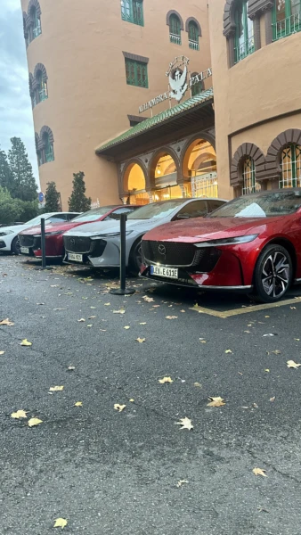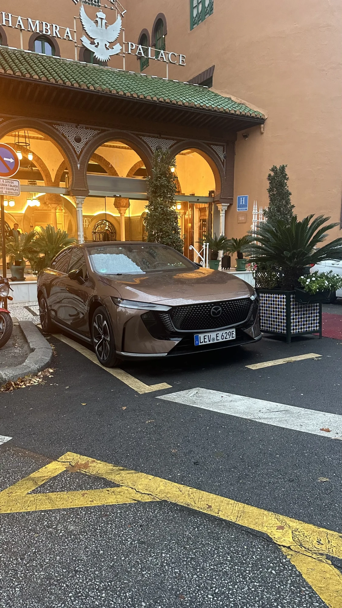 Wanneer we eindelijk uitgeslingerd zijn en bij het hotel aankomen, zien we de elektrische sedan voor het eerst. Net als de digitale uitnodiging stelt ook hier de auto op het eerste gezicht niet teleur. De nieuwe EV staat samen met zijn broertjes en zusjes voor het Alhambra Palace Hotel te schitteren als een stilstaand kunstwerk. Wanneer we de medewerkers van Mazda vragen of we alvast mogen instappen en de straten van Granada onveilig kunnen maken, worden we vriendelijk maar beslist op het strak geplande programma gewezen. Kortom, we moeten nog even een nachtje slapen om te ontdekken of de rijeigenschappen matchen met de looks van de EV.