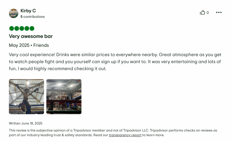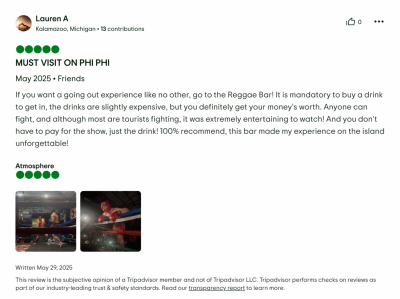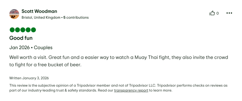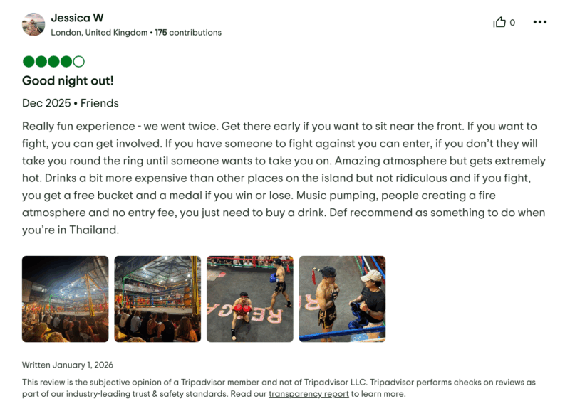 Jessica uit Londen schrijft over de Thaise vechtbar: ”Een ontzettend leuke ervaring. We zijn zelfs twee keer geweest. Kom vroeg als je vooraan wil zitten. Als je wil vechten, kun je zelf meedoen. Heb je iemand om tegen te vechten, dan kun jij je inschrijven. Als je niemand hebt, dan loopt de organisatie met je naar de ring tot iemand het tegen je wil opnemen. De sfeer is geweldig, al wordt het er wel extreem warm. De drankjes zijn iets duurder dan op andere plekken op het eiland, maar niet overdreven. Als je vecht, krijg je een gratis emmer drank en een medaille, ongeacht of je wint of verliest. De muziek staat hard, het publiek zorgt voor een geweldige sfeer en er is geen entreegeld. Je hoeft alleen een drankje te kopen. Absoluut een aanrader als je in Thailand bent.”